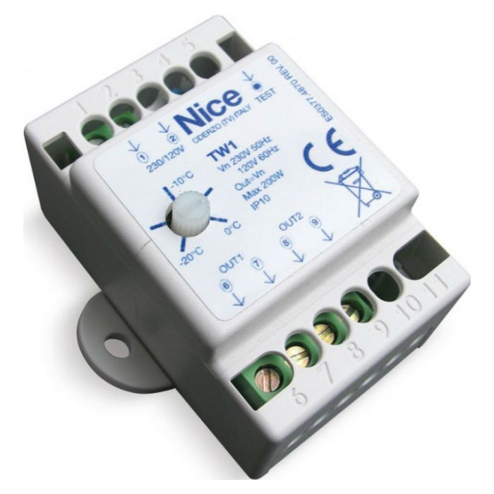 NICE TW1 – термостат для обогревательного элемента PW1 с регулируемой температурой включения. Имеет регулируемый порог срабатывания, который в зависимости от конкретных условий эксплуатации шлагбаума Nice может варьироваться от 0 до -20 градусов Цельсия. Клавиша для проверки функционирования и лампочка для проверки состояния выходов, установленные в термостате, облегчают контроль за работой термостата и повышают общую надежность устройства.