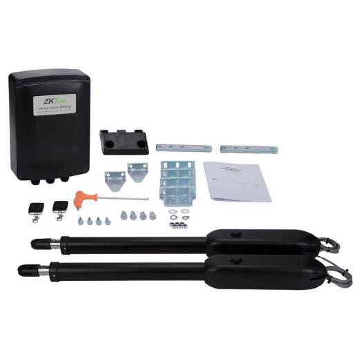 Комплект автоматики состоит из двух высокоинтенсивных, самоблокирующихся приводов, блока управления со встроенным приемником, двух пультов ДУ и набора крепежа, кронштейнов и ключей аварийной разблокировки.