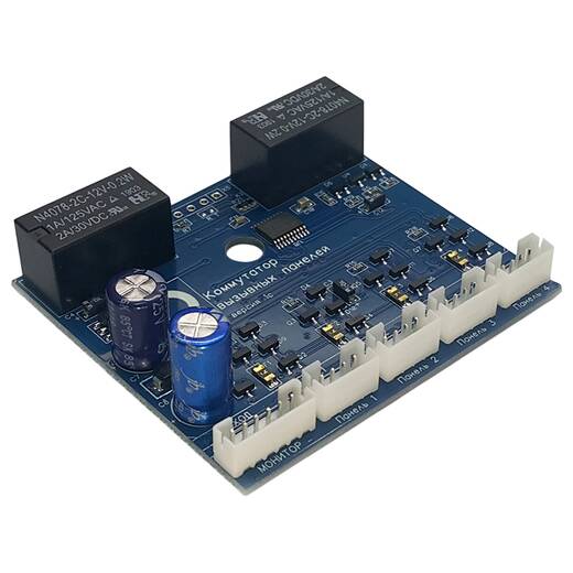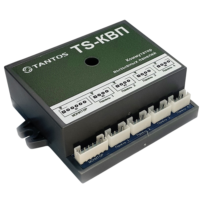TS-КВП – коммутатор вызывных панелей, предназначен для подключения 4-х вызывных 4-х проводных панелей к одному входу монитора.