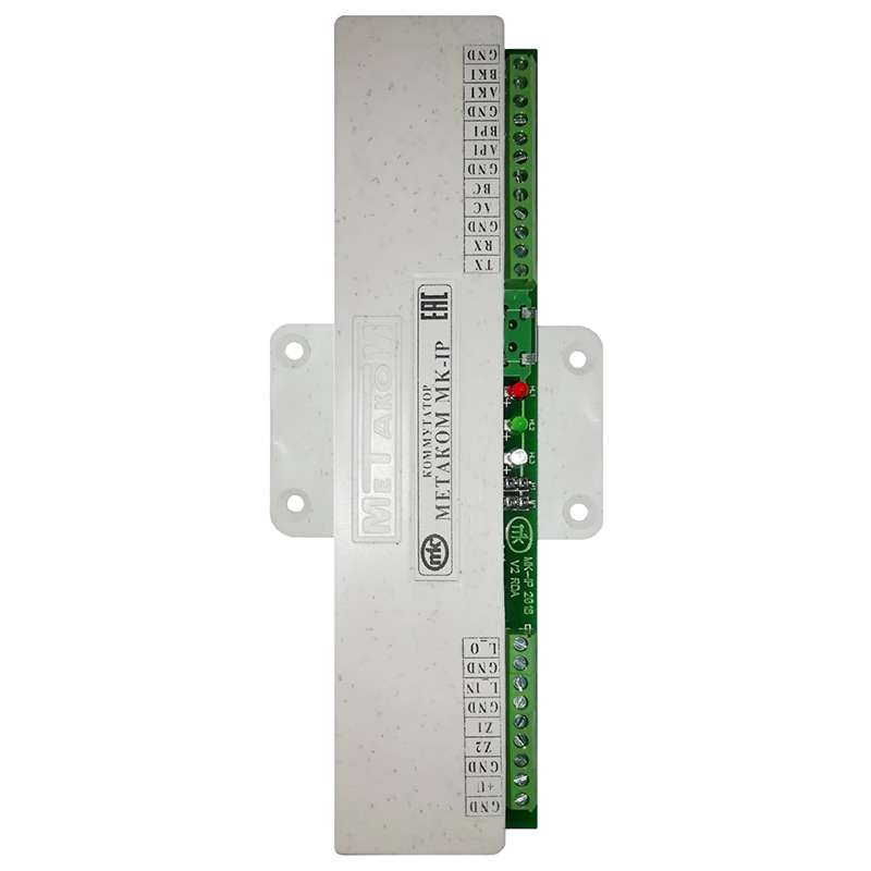MK-IP – коммутатор, предназначен для интеграции блоков вызова МК2018 в систему "Умный домофон" с использованием сторонних IP адаптеров. В качестве IP адаптера может использоваться адаптер РДА Росдомофон (или другие совместимые с коммутатором MK-IP).