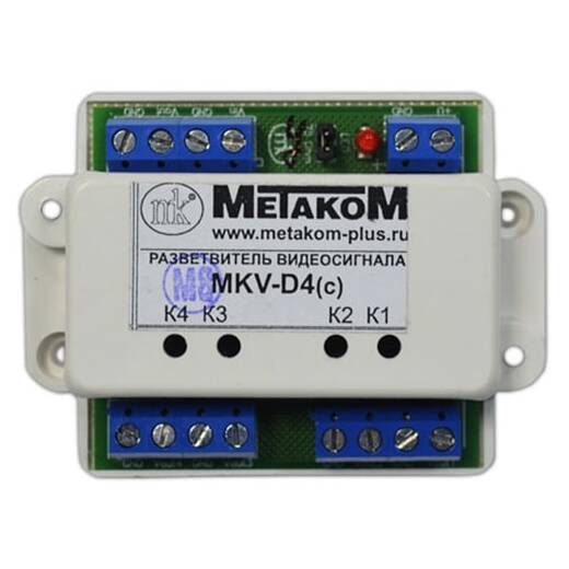 MKV-D4C – разветвитель видеосигнала, предназначен для усиления и распределения видеосигнала от одного источника множеству потребителей, т.е. для подключения абонентских видеомониторов к магистральной линии стандартного видеосигнала в составе домофонных систем МЕТАКОМ.