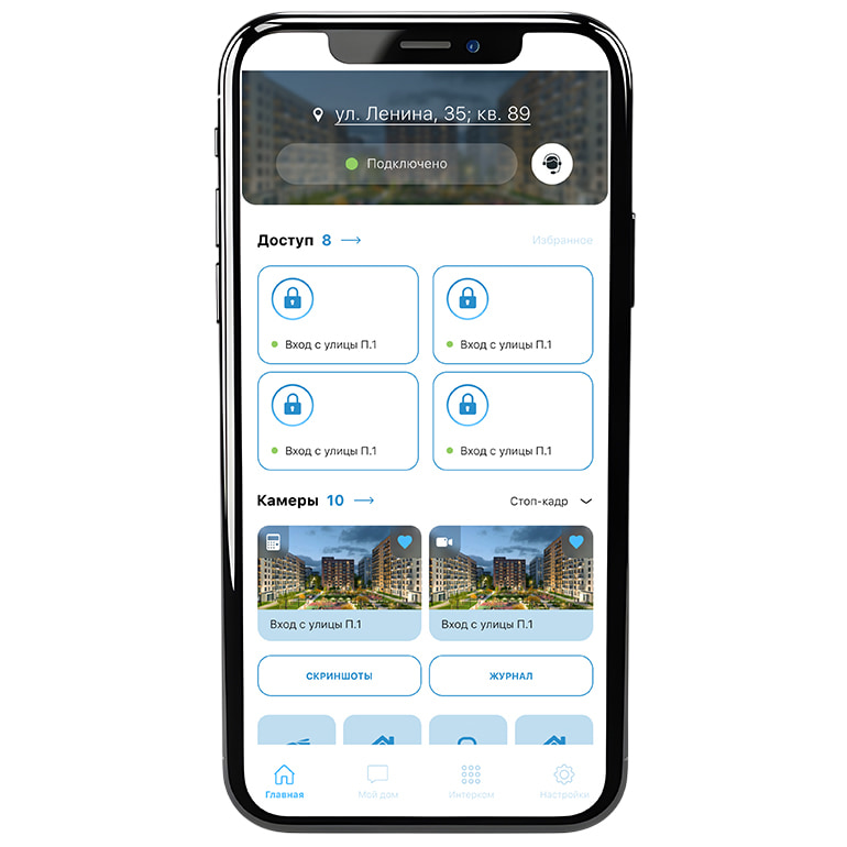 - 4 избранные камеры/домофона на главном экране;