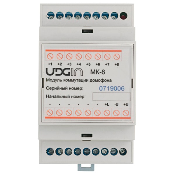 UDG/MK-8 – модуль коммутации емкостью до 8 абонентов. Предназначен для подключения абонентских устройств к подъездной линии связи домофонов UDGIN.