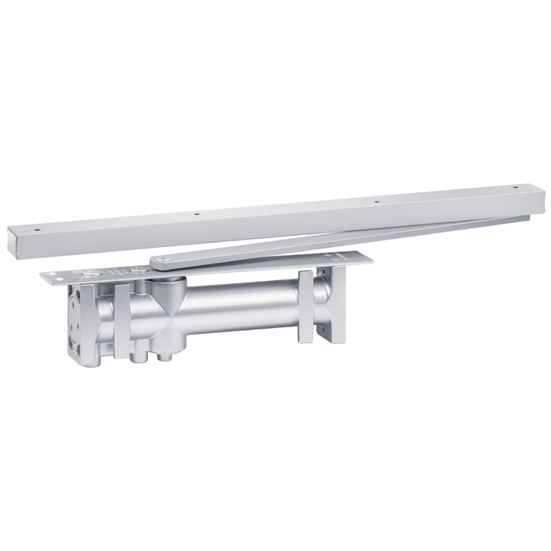 Notedo DC-055 IN+HO – дверной доводчик серебряного цвета, механогидравлический, врезной скрытой установки со скользящей тягой, двухскоростной, с фиксацией двери в открытом положении Hold Open (HO).