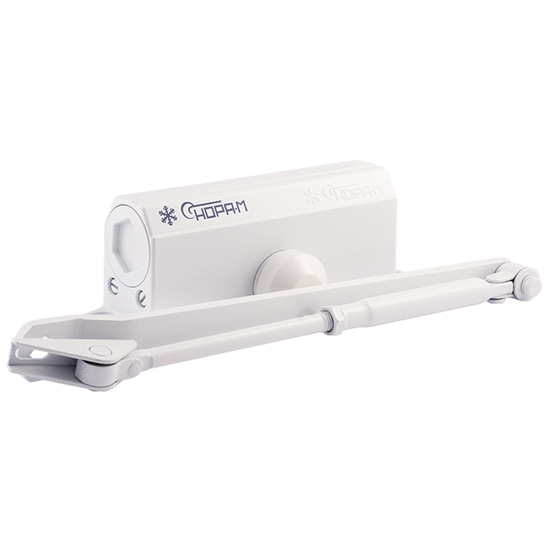 Доводчик с фиксацией: при распахивании двери на 90 и более градусов, механизм удерживает полотно двери открытым. Основные элементы механизма – поршень, шестерня – изготовляются из стали, после чего проходят закаливание. Скорость закрывания и прихлопа можно отрегулировать в соответствии с требованиями конкретного помещения. Доводчик с фиксацией рекомендован к установке в помещениях социальной сферы, в том числе в рамках программы «Доступная среда».
