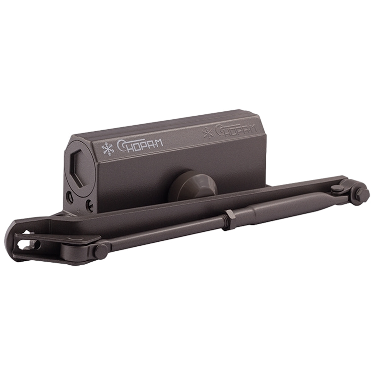 Доводчик с фиксацией: при распахивании двери на 90 и более градусов, механизм удерживает полотно двери открытым. Основные элементы механизма – поршень, шестерня – изготовляются из стали, после чего проходят закаливание. Скорость закрывания и прихлопа можно отрегулировать в соответствии с требованиями конкретного помещения. Доводчик с фиксацией рекомендован к установке в помещениях социальной сферы, в том числе в рамках программы «Доступная среда».