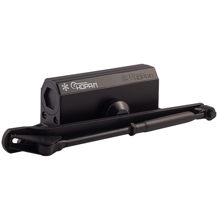 Доводчик с фиксацией: при распахивании двери на 90 и более градусов, механизм удерживает полотно двери открытым. Основные элементы механизма – поршень, шестерня – изготовляются из стали, после чего проходят закаливание. Скорость закрывания и прихлопа можно отрегулировать в соответствии с требованиями конкретного помещения. Доводчик с фиксацией рекомендован к установке в помещениях социальной сферы, в том числе в рамках программы «Доступная среда».