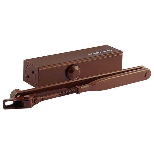 Нора-М 820 (коричневый) – дверной доводчик с быстроразъемным рычагом коленного типа рассчитанный на вес двери от 40 до 120 кг.