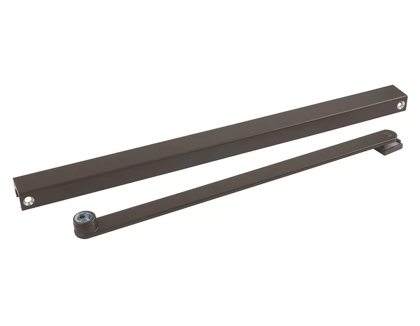 Состоит из рычага, скользящего канала, ползунка, крепежных элементов и торцевых заглушек. Цвет: темно-коричневый.