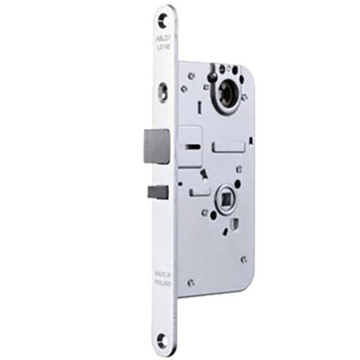 Abloy LC190 – замок серии OneFit для деревянных и металлических входных дверей с автоматическим запиранием ригеля, отпирающийся при помощи ключа, поворотной кнопки цилиндра или нажимной ручки, способ отпирания зависит от заданного режима.