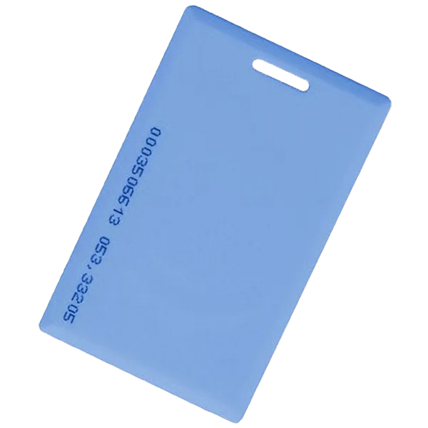 IL-05E BLUE - пластиковая карта синего цвета со встроенным чипом и антенной, с вырезом для крепления и напечатанным идентификационным номером с обратной стороны. На карте нанесен ее код в шестнадцатеричном формате и формате Wiegand 24, что значительно упрощает занесение в базу данных при отсутствии считывающих устройств.