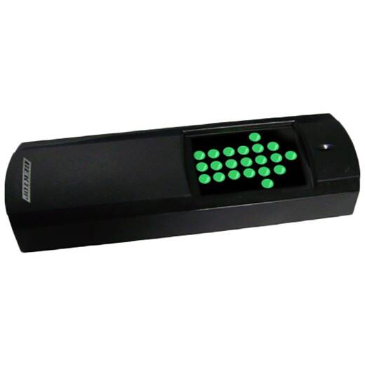 В дежурном режиме на дисплее светится красный крестик (закрыто), при поднесении карточки загорается зеленая стрелка (открыто).