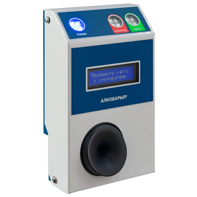 Алкобарьер – стационарный бесконтактный алкотестер, предназначенный для работы в качестве внешнего верифицирующего устройства в составе системы контроля доступа. Применяется для предварительной проверки сотрудников на наличие алкогольного опьянения.