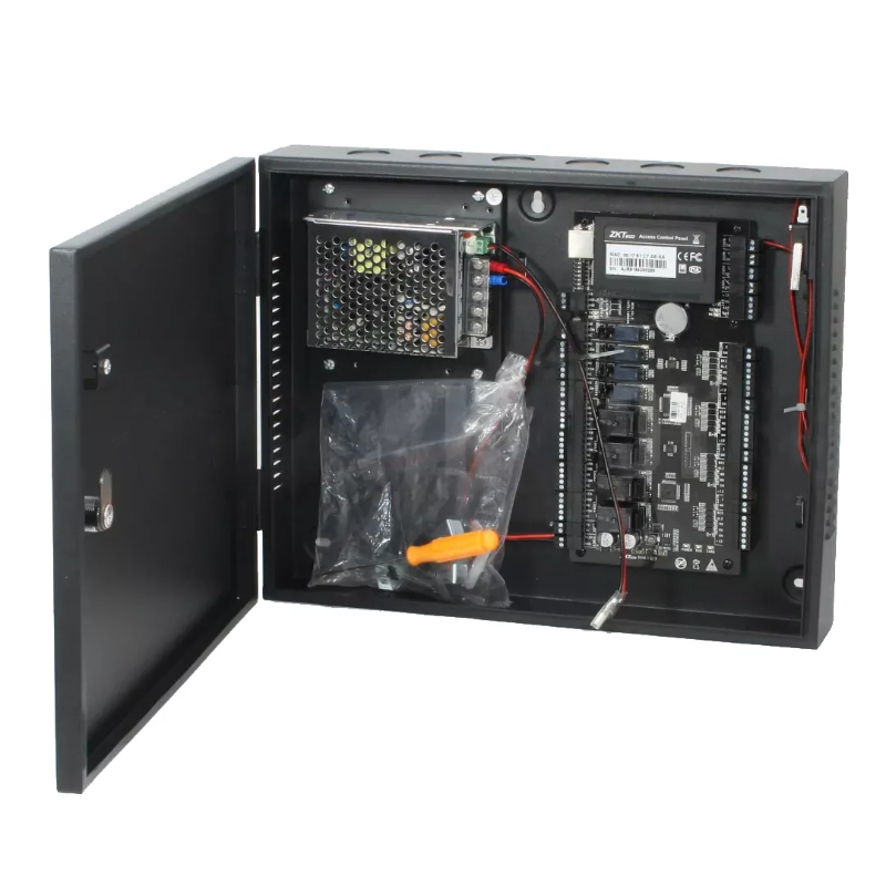 Комплектация: металлический бокс, плата сетевого контроллера, блок бесперебойного питания ZKPSM030B, набор ключей и монтажный комплект.