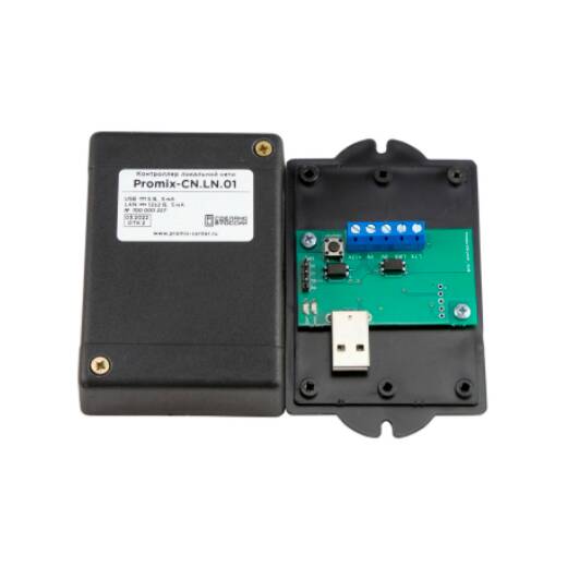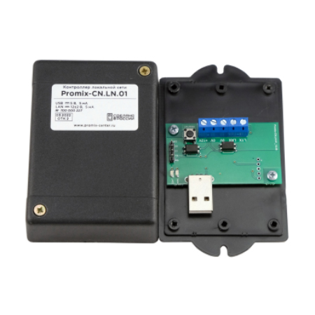 Promix-CN.LN.01 – контроллер локальной сети, входит в состав системы управления Promix-Locker и предназначен для организации сети управления электромеханическими замками, блокираторами, иными механизмами и сканирования их текущего состояния (срабатывание датчиков, потеря связи, предъявление идентификаторов и пр.) по USB и UART интерфейсам.