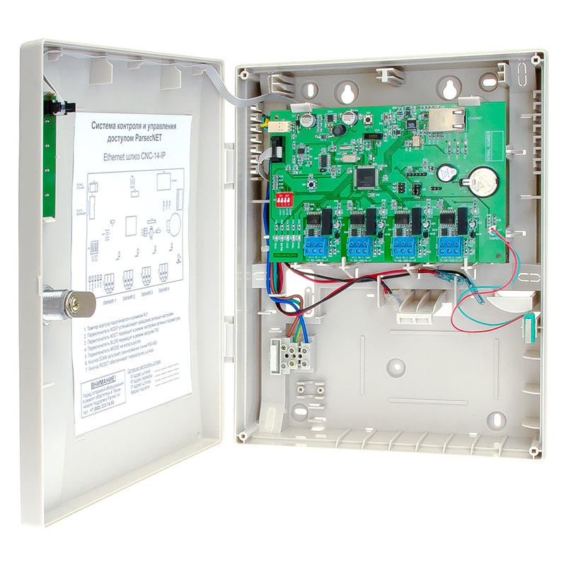 CNC-14-IP – Ethernet-шлюз для работы в составе систем контроля доступа ParsecNET 3 и ParsecNET Office, позволяет объединять территориально удаленные сегменты системы по сети Ethernet.