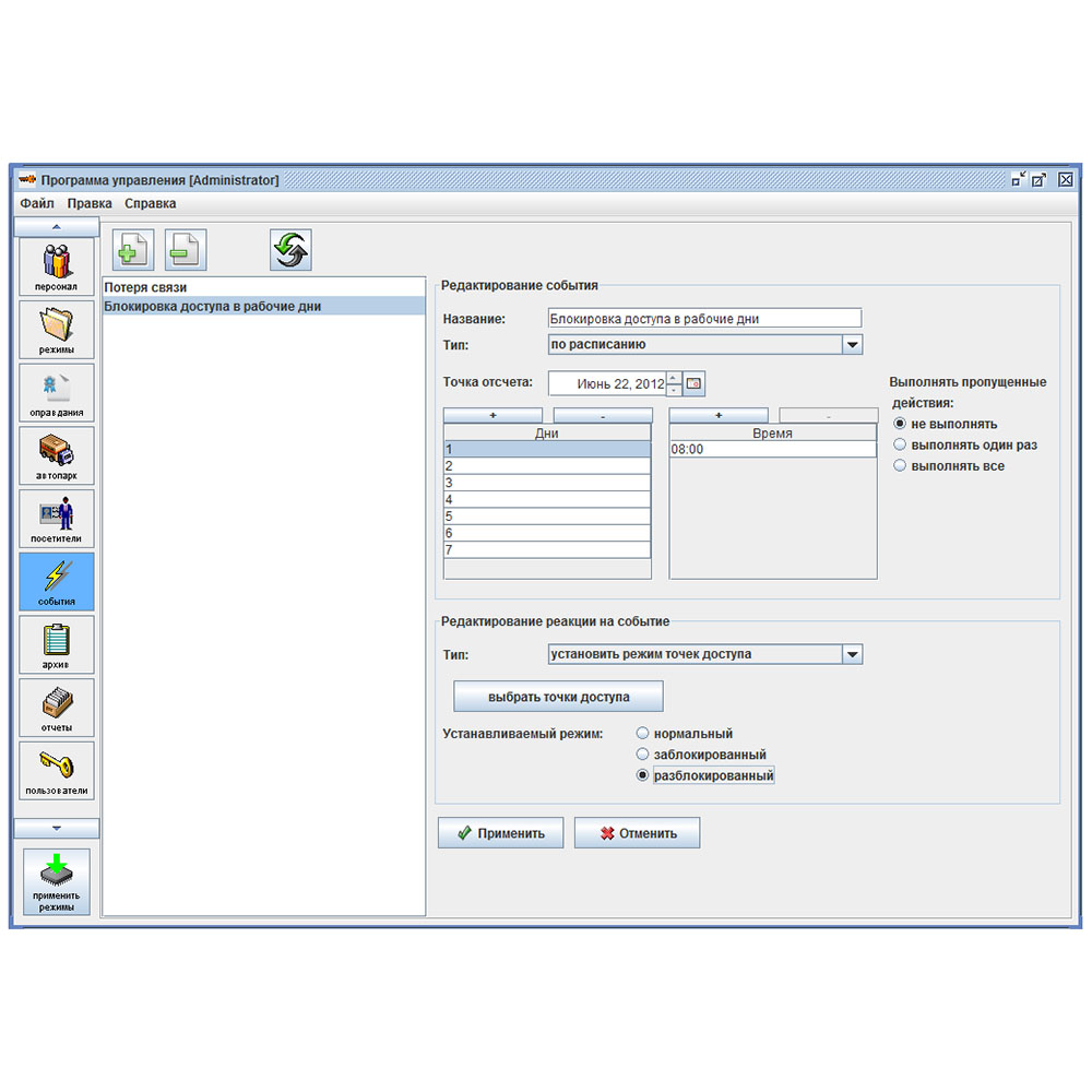 Дополнительный модуль ПО SIGUR «Реакция на события» – дополнительный модуль, который позволяет настроить ответные действия системы, которые будут автоматически выполняться при наступлении каких-либо событий. Количество соответствий "событие-реакция" не ограничено. Возможность произвольно реагировать на происходящие события во многом определяет эффективность СКУД и удобство её использования. Например, благодаря информированию о взломах или выходе из строя точки доступа повышается уровень безопасности на объекте, а возможность смс-уведомлений о проходах конкретных сотрудников позволяет получать максимально оперативную информацию руководству.