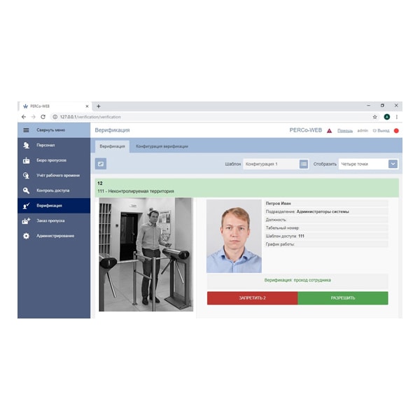 PERCo-WM02 – модуль "Верификация" предназначен для усиления контроля доступа на территорию предприятия и предотвращения случаев прохода по чужому пропуску.
