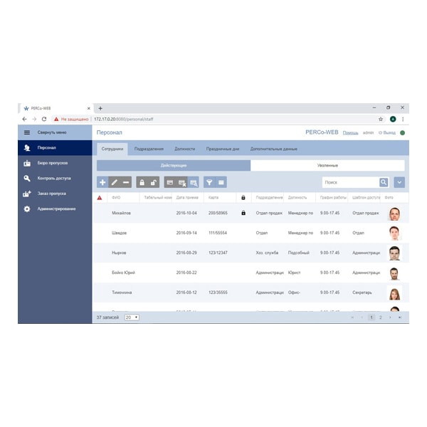 Раздел "Персонал" позволяет автоматизировать процесс ввода и хранения учетных данных сотрудников и создания графиков работы. В разделе предусмотрена возможность ведения списка должностей и подразделений предприятия.