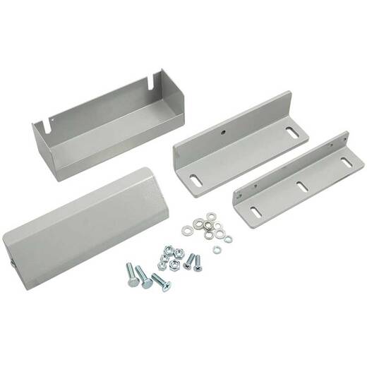 Монтажный комплект состоит из уголка корпуса, уголка якоря, кронштейна, кожуха, кожуха кронштейна и элементов крепежа.