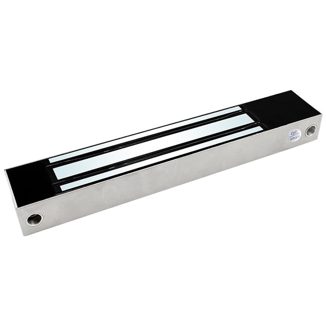 HN-M280W – электромагнитный замок в корпусе из нержавеющей стали SUS 304 и силой удержания 280 кг. Имеет степень защиты от пыли и влаги IP 68, что позволяет его эксплуатацию без дополнительных защитных мер, во влажной среде, например, на улице. В комплекте поставляется крепежная планка, с помощью которой производится установка на горизонтальную поверхность дверной коробки.