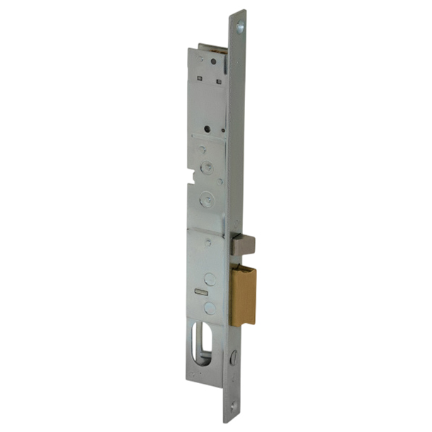 Имеет только электрически управляемую защелку: взводной и запорный ригели. Запорная защелка имеет противоотжимный блокировочный механизм при закрытом состоянии замка. Цилиндровый механизм овальной формы позволяет механически открывать замок. Замок нереверсивный.