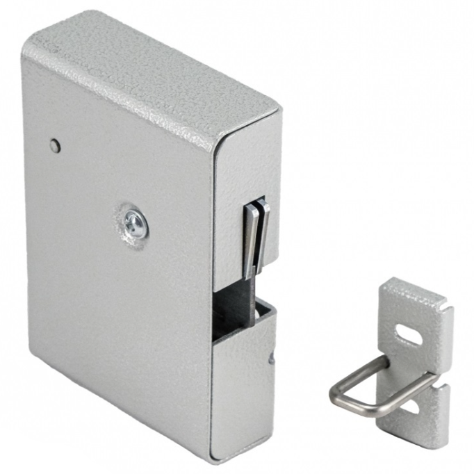Замок устанавливается на внутренние поверхности шкафа перпендикулярно двери. Ответная часть (ригель) устанавливается на дверь.