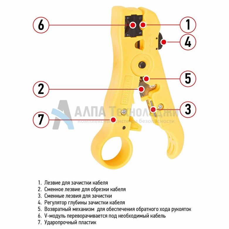 Производит одновременное снятие оболочки и изоляции кабеля поворотом инструмента с помощью двух режущих поверхностей. Ножи выполнены из нержавеющей стали с индивидуальной настройкой для регулирования глубины надреза. Длину надреза можно регулировать.