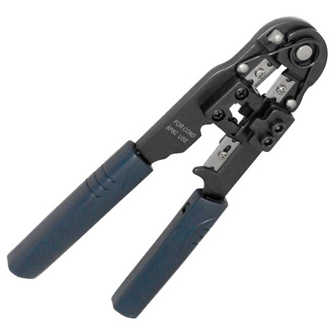 HT-210N (12-3451) – кримпер для обжима компьютерный, универсальный инструмент, предназначен для обжима разъемов RJ-45 (8P8C), а также для снятия изоляции, как плоских, так и круглых кабелей и обрезки проводов.