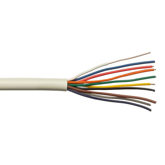 Имеет 10 токопроводящих монолитных жил из медной проволоки диаметром 0.5 мм. Индивидуальная изоляционная оболочка жил выполнена из ПВХ-пластиката отличительных цветов. Внешняя оболочка представлена негорючим ПВХ-пластикатом белого цвета.