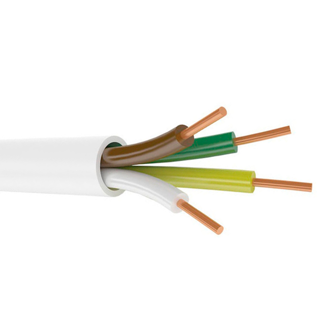 Имеет 4 токопроводящие монолитные жилы из медной проволоки диаметром 0.5 мм. Индивидуальная изоляционная оболочка жил выполнена из ПВХ-пластиката отличительных цветов. Внешняя оболочка представлена негорючим ПВХ-пластикатом белого цвета.