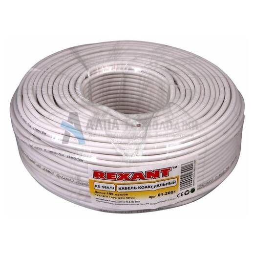 RG-58 A/U 50 Ом Cu/Al/Cu 64% (01-2001) – кабель белый радиочастотный со вспененной полиэтиленовой изоляцией в ПВХ оболочке. Применяется для передачи высокочастотного сигнала в различных системах связи, подключения внешних антенн, радио- и телевещательных системах.