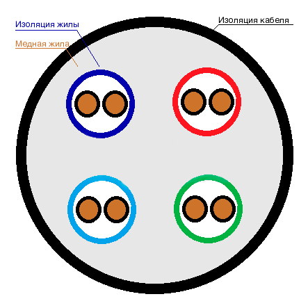 Кабель парной скрутки с 8 однопроволочными медными жилами диаметром 0.40 мм. Индивидуальная изоляция токопроводящих жил выполнена из полиэтиленовой составляющей и окрашена в разные отличительные цвета. Наружная оболочка представлена в виде ПВХ пластиката белого цвета.