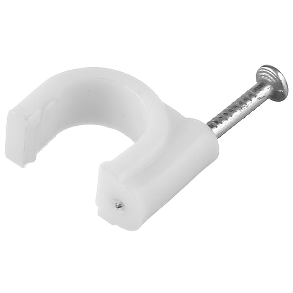 Крепеж кабеля круглый 16 мм – дугообразная пластиковая скоба диаметром 16 мм с гвоздем.