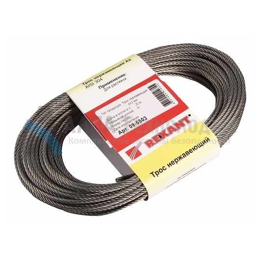 Rexant 09-5503 – нержавеющий трос А2 изготовлен из высококачественной нержавеющей проволоки и соответствует международным стандартам ГОСТ и DIN. Трос является коррозионностойким к коррозии и к внешним воздействиям среды, может применяться и в пресной воде. Применяется при погружении насосов, датчиков в скважины, колодцы, в качестве несущего элемента различных строительных конструкции, в различных типах грузоподъемных механизмов и машин - от ручных талей до подъемных при строительстве подвесных мостов в зависимости от диаметра.