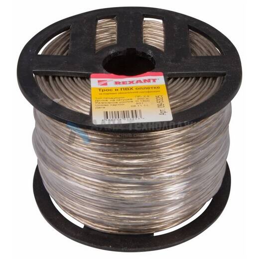 Rexant 09-5325 – стальной трос с полимерным покрытием, свивается из высокоуглеродистой стальной проволоки (латунированной с высоким содержанием углерода) и покрывается ПВХ, выдерживая перепады температуры -60…+110°С при этом не сказываются на эластичности троса. Применяемые марки пластиката существенно повышают устойчивость тросов к воздействию агрессивных сред, солнечного излучения.