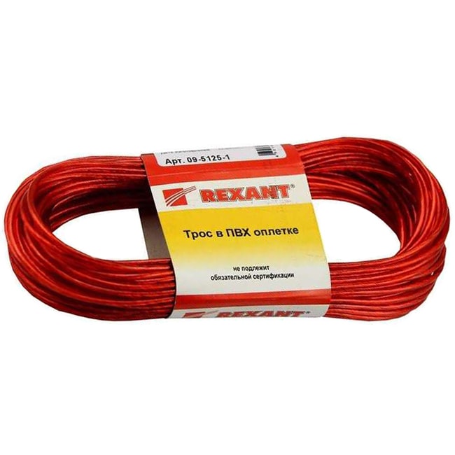 Rexant 09-5125-1 – стальной трос с полимерным покрытием, свивается из высокоуглеродистой стальной проволоки (латунированной с высоким содержанием углерода) и покрывается ПВХ, выдерживая перепады температуры -60…+110°С при этом не сказываются на эластичности троса. Применяемые марки пластиката существенно повышают устойчивость тросов к воздействию агрессивных сред, солнечного излучения.
