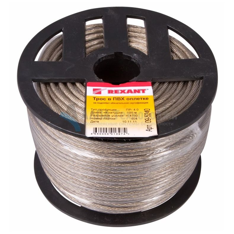 Rexant 09-5240 – стальной трос с полимерным покрытием, свивается из высокоуглеродистой стальной проволоки (латунированной с высоким содержанием углерода) и покрывается ПВХ, выдерживая перепады температуры -60…+110°С при этом не сказываются на эластичности троса. Применяемые марки пластиката существенно повышают устойчивость тросов к воздействию агрессивных сред, солнечного излучения.