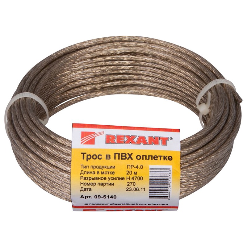 Rexant 09-5140 – стальной трос с полимерным покрытием, свивается из высокоуглеродистой стальной проволоки (латунированной с высоким содержанием углерода) и покрывается ПВХ, выдерживая перепады температуры -60…+110°С при этом не сказываются на эластичности троса. Применяемые марки пластиката существенно повышают устойчивость тросов к воздействию агрессивных сред, солнечного излучения.