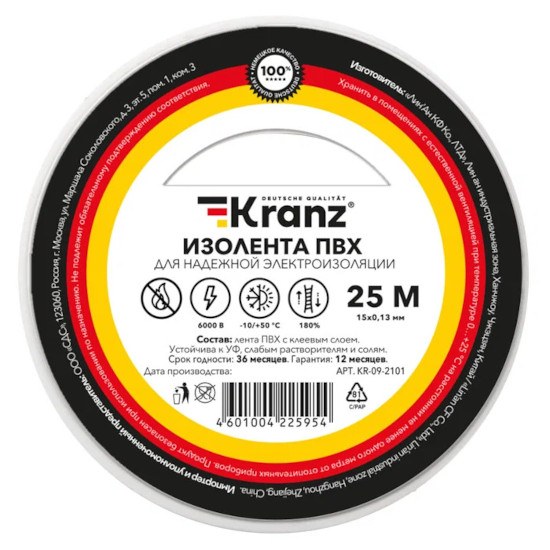 Изолента 15 мм × 25 м Kranz – изолента предназначена для электрической изоляции, цветной маркировки, соединения, защиты от внешних факторов и герметизации кабелей, проводов и шнуров.