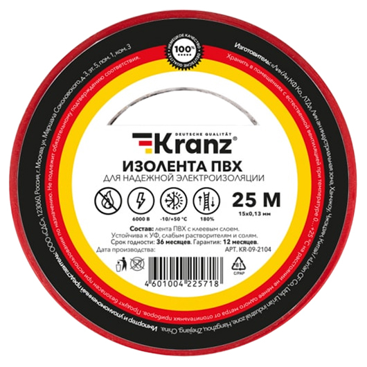 Изолента 15 мм × 25 м Kranz – изолента предназначена для электрической изоляции, цветной маркировки, соединения, защиты от внешних факторов и герметизации кабелей, проводов и шнуров.