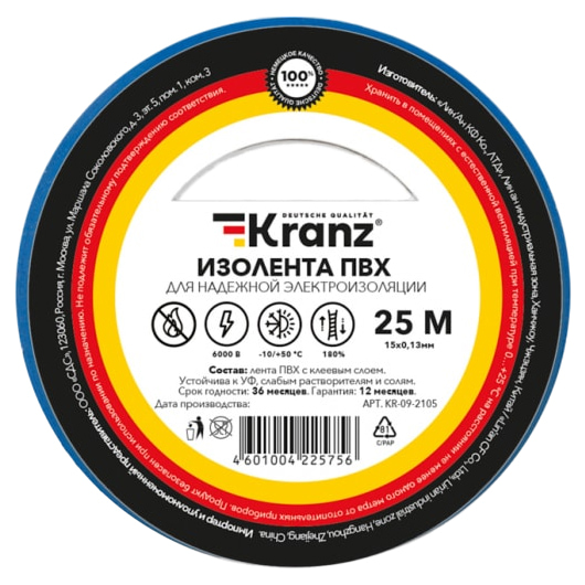 Изолента ПВХ 25м х 15мм х 0.13мм (синий) Kranz