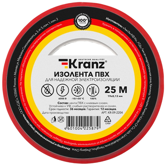 Изолента 19 мм × 25 м Kranz – изолента предназначена для электрической изоляции, цветной маркировки, соединения, защиты от внешних факторов и герметизации кабелей, проводов и шнуров.