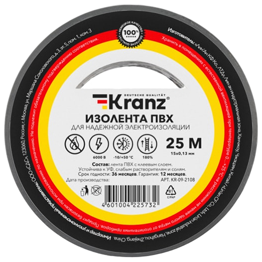 Изолента 19 мм × 25 м Kranz – изолента предназначена для электрической изоляции, цветной маркировки, соединения, защиты от внешних факторов и герметизации кабелей, проводов и шнуров.