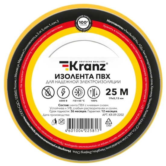 Изолента 19 мм × 25 м Kranz – изолента предназначена для электрической изоляции, цветной маркировки, соединения, защиты от внешних факторов и герметизации кабелей, проводов и шнуров.