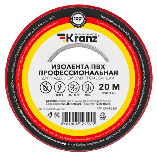 Изолента ПВХ профессиональная 20м х 19мм х 0.18мм (красный) Kranz