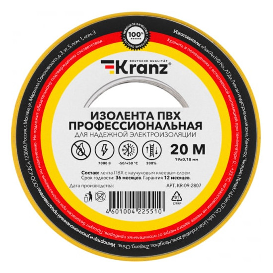 Изолента ПВХ профессиональная 20м х 19мм х 0.18мм (желто-зеленый) Kranz