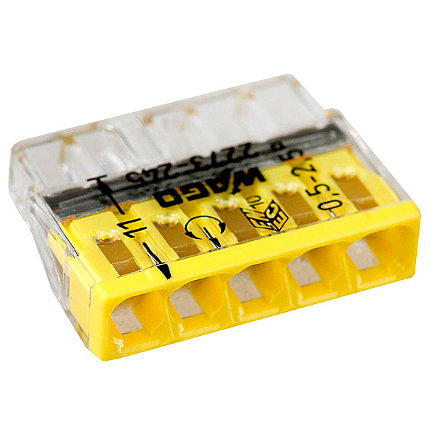 Wago 5 (2273-245) – соединительная клемма 5-контактная с пастой для быстрого монтажа проводов из алюминия и меди 0.5-2.5 мм².