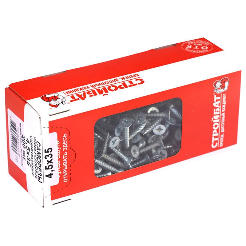 Саморез универсальный 4,5х35 мм – саморез для соединения деревянных элементов, гипсокартонных плит, тонкого листового металла и других материалов; для сквозного монтажа конструкций к деревянным основаниям, а также совместно с дюбелями шурупы универсальные используются для монтажа в пустотелые и полнотелые основания. Цинковое покрытие защищает их от коррозии. Потайная головка саморезов обеспечивает эстетичность внешнего вида готовых изделий в местах крепления элементов.