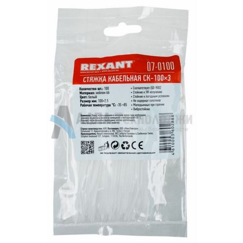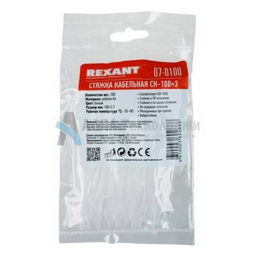 Rexant 07-0100/07-0101 – хомут нейлоновый (кабельная стяжка) для крепления или обвязки в жгут кабелей и проводов, крепления гибких гофротруб, а также других предметов к несущей поверхности или для соединения между собой. Такая стяжка используется при проведении электромонтажных работ, при монтаже структурированных кабельных систем, для бытовых нужд, а также в других отраслях народного хозяйства.
